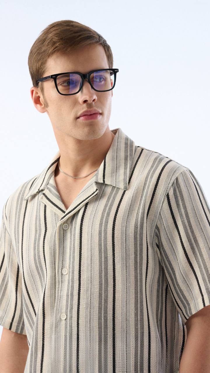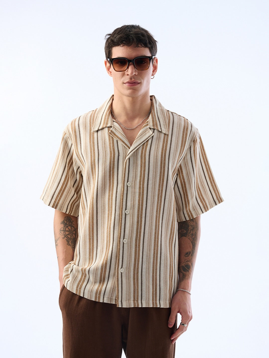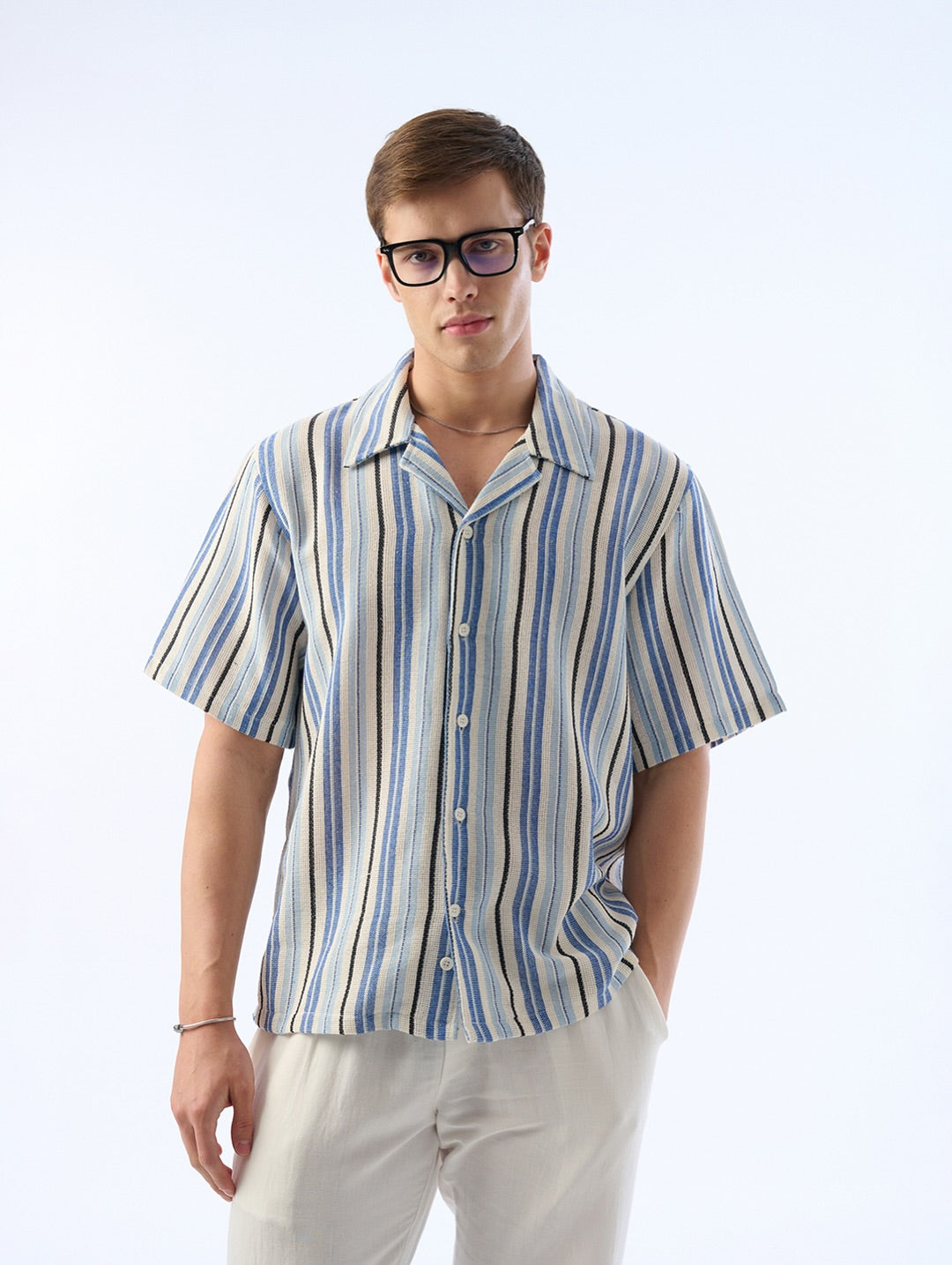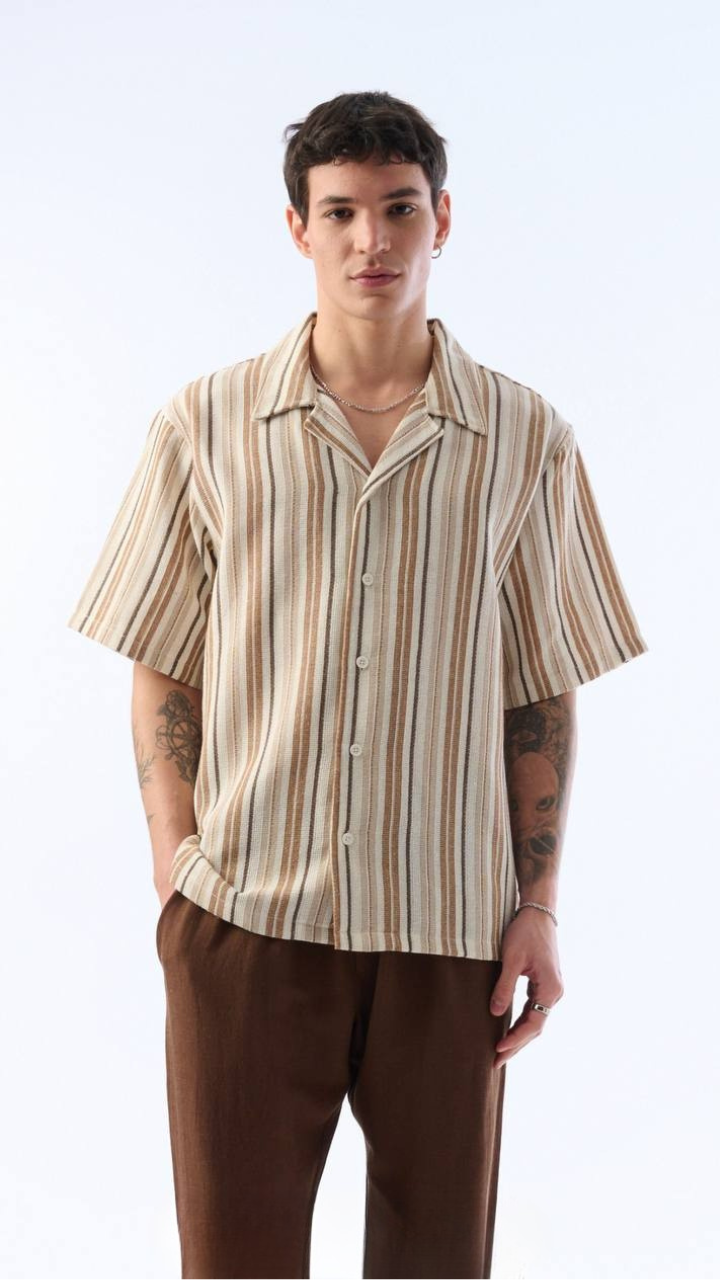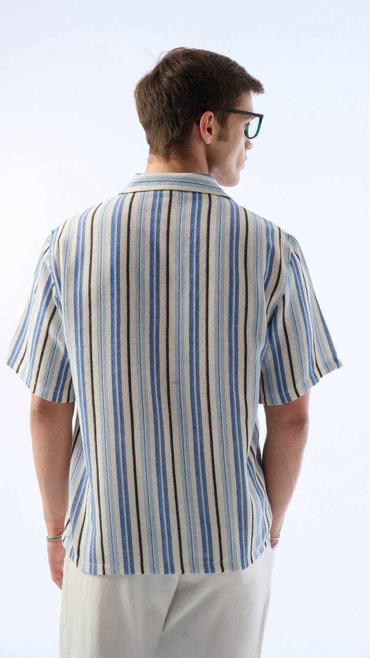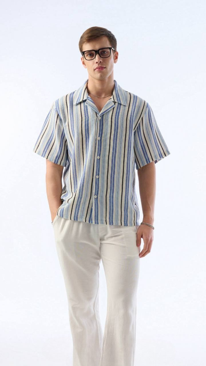Lightweight and breathable short-sleeve shirt with vertical blue and beige stripes. Features a relaxed fit, soft fabric, and button-up front – ideal for summer outings or casual everyday wear. Style it effortlessly with light trousers or shorts for a fresh and timeless look.